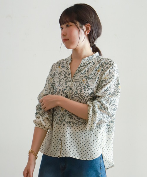 【NOMBRE IMPAIR ノンブルアンペール】■パネルリーフ葉と鳥を組み合わせて2種の柄をミックスしたようなパネル状のオリジナルプリント。柔らかい生成りベースにニュアンスのあるグリーンとブルー、イエローの鳥が映える配色。下部分は葉のプリントにして抜けをプラスしたデザインに。華やかながらも馴染みます。シンプルなスタンドネックに、スキッパーのネックで顔回りはすっきり。前開きなので羽織としても着回せます。素材はキュプラ混のさらっと上質な風合い。程よい薄さでシーズンを問わず活躍します。■Coordinate1枚でナチュラルな着こなしが仕上がる主役級ブラウス。ボトムはデニムなどシンプルでも決まります。ベーシックなサイズ感と着丈でレイヤードがしやすく、冬はニットカーディガンやジャケットのインに重宝します。洗濯:ドライクリーニング※画像の商品はサンプルです。前の着丈が1.5cm長く変更になります。実際の商品と色味、仕様、サイズ等が若干異なる場合がございます。
