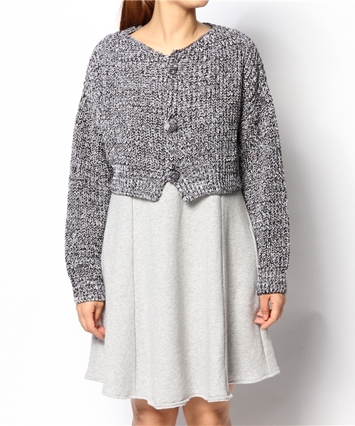 i(アイ) 暖かみのある素材のミックスニットカーディガン。ショート丈ですっきりと着こなせます。同素材のスカートとのセットアップコーデもお勧めです!