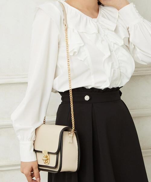 2021 秋アイテム シンプルなワンカラーにパイピングがアクセントになったショルダーバッグ。 しなやかな素材で仕立てているので上品な印象に。 オンオフ問わずに活躍するおすすめのアイテムです。 パズルのような回転式の開閉部が印象的。 チェーンストラップでコーディネイトを華やかに彩ります。 メイン荷室の内側にはファスナー式のポケット、フラップ内側にも便利なポケット付き。 ・A4サイズ不可 ・裏地あり ・内ポケットあり ・重量:約434g
