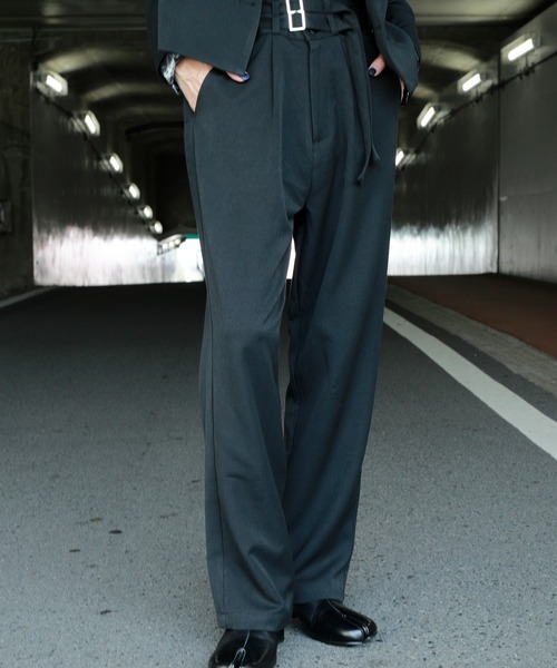 TR DOUBLE BUCKLE TUCK WIDEPANTS - TRダブルバックルタックワイドパンツ - オリジナリティー溢れるハイウエストデザインとダブルバックルデザインをアクセントにしたTRダブルバックルタックワイドパンツ タックインでもアウトでもスタイリッシュに着用できるように計算されたタック入りの太すぎず細すぎない絶妙なハイウエストワイドシルエット。 特にトップスをタックインして着用する事により更に足長効果がUP。 ウエスト部は二つのベルトを締めて着用するダブルバックルデザインでまとめ、コーディネートに個性と良きアクセントを。 素材は高級感を感じさせるEspina定番のTR素材を使用しドレッシーにまとめあげた。 単品使用はもちろんのこと同素材のTRショートダブルテーラードJKと合わせてのセットアップ着用もおすすめ。 ※こちらの商品はパンツ単体での販売となります。 セットアップ品番:210762 TRショートダブルテーラードJK Espina 21AW COLLECTION "NOSTALGIA" 過去に見た情景やその時に感じた感情からインスピレーションを受け、どこか懐かしくセンチメンタルな空気感をEspinaのフィルターに落とし込んだコレクション。 インフルエンサー TAKUMA ディレクション 「Espina/エスピナ」 "上品で高貴な棘"を身に纏い、他の誰かとは違った日常を。