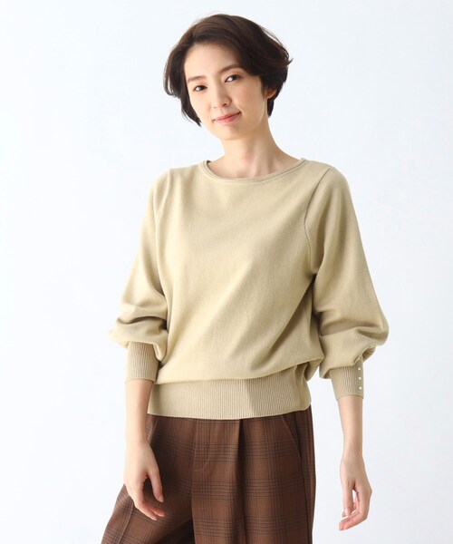 【デザイン】 袖口に施されたフェイクパールデザインが大人可愛いニットです。 ボリュームスリーブのトレンド感に、小ぶりパールの愛らしさが引き立ち、ぱっと華のあるスタイリングを叶えます。 コーデがきまるデザイン性を発揮しながら、ワンカラーやボーダーのシンプルな展開ですからボトムをえらばずに着用できるのも魅力です。 【生地感】 毛玉になりにくい柔らかな肌触りのレーヨン混素材を使用したハイゲージニット。 こちらの商品は主に冬に着用いただける商品です。 モデル情報:身長165cm B80 W60 H86 着用サイズ:02(M) 店舗へのお問い合わせ商品番号:741-13002 ●製品寸法: 02(M):着丈58cm B96cm 袖丈59cm 肩幅34cm 03(L):着丈59cm B100cm 袖丈59cm 肩幅37cm 備考: