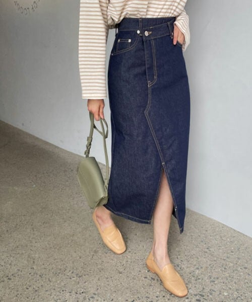カジュアルで女性らしいデニムスカート。深いフロントスリットで色っぽさを+。動きやすくデザインしています。斜めのボタンラインがポイントでファスナーもあるので着脱楽ちん! ※WEARに記載してある金額と、DHOLIC通販サイトに記載してある金額にシステム都合上、稀に誤差が生じます。正しい金額はDHOLIC通販サイトに記載された金額です。