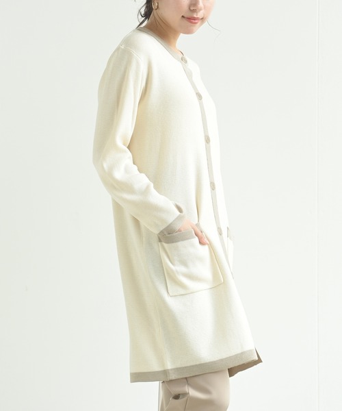すっきりバイカラーのロングカーデメリハリと存在感をアピールするバイカラーデザインのカーディガン。デザイン性のあるカーデなのでジャケット感覚でお使いいただけます。シンプルなノーカラーはカジュアルからフェミニンまで幅広いコーデに◎。お尻まですっぽり隠れるロング丈が縦ラインを強調してくれます。羽織るだけでなくボタンを閉じてチュニックライクに着てもOK。しっかりとしたミラノリブで大人のスタイリングに仕上げてくれる1枚です。 裏地なし 伸縮性なし 薄手 前開きボタン留め 裾ポケットあり 編み加減や染めの具合でデザインやサイズ等異なる場合もございます 洗濯:手洗い可