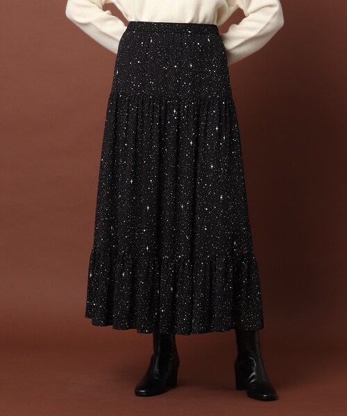 【星空をイメージしたプリントが心くすぐるティアードスカート】 <商品説明> 一見ドット柄のようですが、実は星空をイメージしたプリント生地を使用した、裾に向かってギャザー分量を増やしたボリューム感が華やかなティアードスカート。 ウエストゴムですがスッキリ着ていただける、シルエットに拘った一枚。 <素材説明> 星空をイメージしたオリジナルの柄をきれいなドレープのジョーゼットに抜染プリントしました。 黒ベースの繊細な柄なので大人っぽい雰囲気です。 <着こなし・スタイリングのおすすめなど> スウェットやパーカーとスニーカーでカジュアルなスタイリング、ミドルゲージのニットとフラットシューズでレディライクな雰囲気で着るのもおすすめです。 ※ポケットなし ※裏地あり こちらの商品は主に冬に着用いただける商品です。 モデル情報:身長175cm B80 W60 H88 着用サイズ:38(M) 店舗へのお問い合わせ商品番号:085-73072 ●製品寸法: 36(S):総丈88cm W65cm 38(M):総丈92cm W68cm 備考: