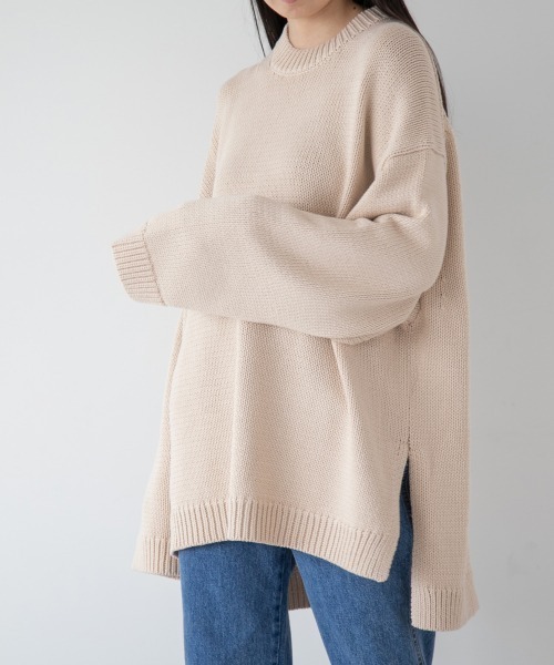 ■デザイン■ゆったりとしたプルオーバーニット。ユニセックスで着用できるような大きめのサイズ感です。ドロップショルダーやサイドスリットのディティールで抜け感のある着こなしに。■スタイリング例■ボトム選ばず着まわせるオーバーサイズニット。ゴブランパンツやカラーボトムとの相性◎です。 【yuw シーズンテーマ】なぜか目にとまる静かな存在感のある服。遠くから見るとシンプルなのによく見るとこだわりを感じる。さまざまな要素をちょうどいいバランスでシンプルな特別感を表現※こちらの商品は、パッケージも商品の一部となりますので、破損している場合、返品・交換を承ることができません。