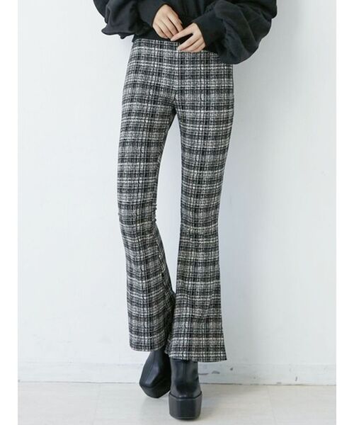 ツイードチェックがプリントされた少し厚手のストレッチ性のあるフレアパンツ。 レギンス感覚で気軽に履いて頂けるので、オンオフを選ばずに楽ちんに着回ししていただけます。 スタイルアップできるようこだわったったシルエットのデザインのフレアーパンツ。 低身長の方は厚底のシューズでスタイリングしていただけると足長効果にもなります。 コーデ:Bigシルエットのスウェットやニットトップスとスタイリングがオススメです。