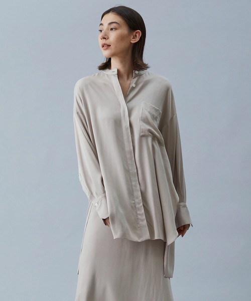 絶妙なトロミ感と色落ち感のある素材を使用したロングシャツ。たっぷりとしたドレープ感のあるオーバーサイズシャツで、前後差のある長めの着丈に仕上げました。脇スリットは深めに入れており、同素材のパンツとセットアップで合わせたときに、ポケットに手を入れやすいぐらいの位置に設定しています。