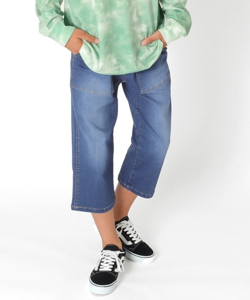 どんな動きにもフィットしてくれる、人気のスーパーストレッチデニムを使用した7分丈パンツです。 程よい厚みの9.5ozデニムを使用し、ロングシーズン着用いただけます◎ 裾に向かって細くなるテーパードシルエットに、7分丈で足元に抜け感をプラス。 股下のマチ仕様で動きやすく、伸縮性抜群のデニム素材は活発な男の子にとってもオススメ! ウエストゴム仕様で着脱楽々なのも嬉しいポイントです。 本格的な色落ち加工に、金茶ステッチでアクセントをプラス。 デニムらしいブルーカラーと、濃いめのネイビーカラー(DE.ブルー)の2色展開。 オーバーサイズなトップスを合わせたラフなスタイルがオススメです。 7分丈なのでラインソックスやカラーソックス、ハイカットスニーカーなど足元のオシャレもお楽しみいただけます♪ どんなトップスとも合わせやすく、デイリー使いにとっても便利! たくさん穿きこなして、デニムならではの色落ちや風合いをお楽しみください◎ 【ポケット】 フロントポケット×2、ヒップポケット×2 【モデル】 身長160cm、体重44kg、着用サイズ:160cm(DE.ブルー) 身長164cm、体重45kg、着用サイズ:170cm(ブルー) 【ご注意点】 ■着用の際、後ポケットについているタグはお取りください。その際、生地を切らないようにご注意ください。 ■色落ち加工を施し、職人により手作業で仕上げている為、製品によって風合いや寸法に個体差がございます。あらかじめご了承ください。 ■商品特有の匂いがございますが、数回ご洗濯いただくことで軽減されます。 ■この製品は非常に色落ち、色移りしますのでご着用の際は下記の点に十分ご注意ください。 ・着用と洗濯を繰り返すことで色落ちが進み、使い込んだ風合いになります。 ・白・淡色系衣料品と合わせて着用されると摩擦によって他の衣料品に色移りします。 ・雨の日、汗等濡れた状態は、さらに他の衣料品等への色落ち色移りがしやすくなります。 ・保管の際は、色移りを防ぐ為、白・淡色の衣料品と重ねないでください。 ・日光(または照明)を長時間受けると黄変の恐れがありますので着用・保管の際はご注意ください。 ※ジャストウエスト、ハイウエストではなくやや下めで、股上に少し余裕を持たせて着用いただくと、モデル着用画像のようなキレイなシルエット・着丈で着用いただけます。 ■GLAZOSのお洋服は格好良いシルエットを目指し、一般的なお洋服より少し細身の作りにしております。実寸サイズをご確認の上、サイズをお選び下さいませ。