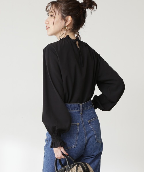 前後2Wayで着られるシャーリングハイネックブラウス。ギャザーネックとV開きリボンデザインの前後2Way仕様です。首元と袖口のギャザーシャーリングデザインが、表情をやわらげるアクセントになります。ボトムに合わせて、カジュアルにもフェミニンな雰囲気にもデイリーに活躍できます。
