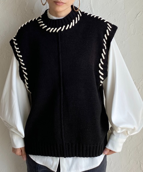 太めの毛糸をざっくり編みした配色のハンドステッチデザインが可愛い、袖なしのプルオーバーニットベストです。 首元はシンプルなクルーネックデザインですっきりとした印象で着ていただけるニットベストです。 手編みの配色ステッチのほかに、フロントとバックのセンターに縦に凹凸のあるラインを入れたアウトリンキングデザインがトレンド感あふれるニットベストです。 シンプルな編み柄ですが、裾回りや袖口は太めのリブ編みで編み柄の切り替えもお楽しみいただけます。 春、秋、冬とロングシーズン気回せる、おすすめのニットベスト。 真夏も暑い日を除き、初夏や晩夏には1枚でサラッと着たり、サロペットやキャミワンピのインナーに着ても可愛いニットベストです。 着丈は、ショート丈とロング丈の中間くらいのスタンダードな丈感のニットベストです。 長袖のシャツやブラウス、ワンピースなどとのレイヤードもバランスが取りやすくおすすめです。 1枚あるとコーデが格上げする、おすすめのセーターベストです。 ・・・・・・・・・・・・ ◆裏地 なし ◆伸縮性/ストレッチ あり ◆ポケット なし ◆光沢 なし ◆洗濯方法 手洗い洗濯 ・・・・・・・・・・・・ [コーディネート] 春や秋は、薄手のカットソーや白のロンt、シャツ、ブラウスと合わせて、真冬はインにタートルネックのカットソーやインナーニットなど合わせていただくと、かわいく着ていただけます。 夏も半袖Tシャツや、ノースリーブのタンクトップと合わせてサラッと着ていただけるニットベストです。 ぽわんとした袖がかわいいボリュームスリーブのシャツやブラウスとのレイヤードコーデで、より今っぽい雰囲気に。 スタンダードな丈感のニットベストで、スカートやパンツとのバランスも取りやすいニットベストトップスです。 [カラー] ブラック(黒)…配色ステッチ オフホワイト アイボリー…配色ステッチ ベージュ ※屋内外での撮影や、光量、光の当たり具合で色味が違って見える場合がございます。 また、ご覧のモニター環境により、画像の色味と多少異なる場合がございます。 ★《お気に入り登録》でお得な情報がいっぱい★ ◆商品のお気に入り登録◆ 【カートに入れる】右側のハートマークをクリック。 完売カラーの再入荷通知や、ラスト1点の通知、セールの通知も受け取ることができます。 ◆ブランドのお気に入り登録◆ ブランドタグのページからお気に入りをクリック。 新商品、新作や 人気 完売アイテムの再入荷など、いち早くブランドのお得な情報を受け取ることができます。 【She's Closet-シーズクローゼット】 おしゃれな、大人可愛いトレンドアイテムや、上品なきれいめカジュアルアイテム、かわいい韓国風アイテムなど随時入荷しております。 20代前半から、30代前後半、40代くらいまでの幅広い年齢層のお客様にマッチするような、レディースの定番アイテムからトレンドアイテムまで幅広くお取り扱いしております。