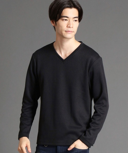 Vネックの長袖プルオーバー。ニットの様な見た目ですが、Tシャツの様な仕立てにする事で軽く仕上げました。程良い伸縮性もありストレスフリーな着用感です。生地にはヘリンボン柄のハイゲージニットの裏面にポリエステル天竺をボンディングした素材を使用。高級感のある上品な光沢と繊細な柄が特長。裏面はサラッとした肌触りで袖通りも良い為、一枚でも着用出来ます。