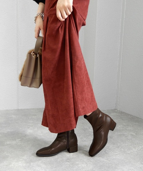 [ AW2021 / minia ] コーデに欠かせない万能フィットブーツ 太めのチャンキーヒールは高すぎない4cmヒール タイトに見えるブーツ丈は、 やわらかなフェイクレザーを使用しているので履き心地◎ 手軽にスタイリッシュな足元が完成するので、 冬らしいボリューミーなスタイリングにぴったりなブーツです。 ニット素材のスカートやワンピース・パンツとも相性抜群。 重ためゆるずるなレイヤードスタイルもおすすめ。 ミニ丈のショートパンツやスカートはもちろん、 膝丈ハーフパンツともバランスの取りやすい丈。 また安定感のあるチャンキーローヒールだから ちょっと丈長めのパンツスタイルもバッチリきまります。 らくちんさと美脚効果を併せ持つローヒールフィットブーツは 幅広いスタイリングで活躍するからコスパもGOOD。おすすめです。 ----------------- ・ブラック ・アイボリー ・ダークブラウン ----------------- ●スペック(M) ・ヒール高さ…約4cm ・片足重量…約280g ・ブーツ丈…約16cm ・履き口周り(内径)…25cm ・履き口周り(平置き)…12.5cm ・中敷下全体に5mmの低反発スポンジを採用。 ・筒裏/裏は、ふわふわ起毛生地のあったか仕様です。 ----------------- ●サイズ目安 ・Sサイズ…22.5cm程度 ・Mサイズ…23.0~23.5cm程度 ・Lサイズ…24.0~24.5cm程度 ・LLサイズ…25.0cm程度 ----------------- ●サイズ感 標準的。 23.0cm(幅甲普通)はMサイズで少しつま先があまります。 23.5cm(幅甲普通)はMサイズがちょうどでした。 23.5cm(幅広甲高)も、Mサイズでぴったり!甲も幅も問題ありません。 < 足幅 > 狭い □□■□□ 広い < やわらかさ > 柔らかい □■■□□ 硬い ----------------- ●サイズ詳細( S / M / L / LL ) 【甲周り(底面+甲一周)】 20.9 / 21.6 / 22.3 / 22.6 【足幅(底面)】 7.6 / 7.8 / 8.0 / 8.1 【ブーツ丈(かかと~履き口)】 16.0 / 16.5 / 17.0 / 17.3 【履き口周り(一周)】 25.8 / 26.8 / 27.8 / 28.3 ----------------- minia/ミニア いつものコーデにプラスするだけでトレンド感がUPするようなアイテムを提案。結婚式やパーティ・二次会でも使えるシンプル上品なアイテムから、通勤・オフィスカジュアル・通学などデイリーユースに使えるカジュアルな定番アイテムまで幅広くラインナップ。 靴・バッグをはじめ、イヤリング・ピアス・ネックレス・ヘアゴムなどのアクセサリー/ヘアアクセサリーなど、韓国ファッションで人気のアクセ・雑貨も取り扱っています。プレゼント/贈り物/お返しにもぴったり。 試しやすいプチプライス~素材や機能性にこだわったアイテムもご用意。また、靴箱に再生紙を使用するなど環境に配慮したサステナブルなものづくりに取り組んでいます。姉妹ブランドに『alala』『Una gardenia』『Hercheek』。 ※お使いのモニターや閲覧環境により、実際の色味と違って見える場合がございます。 ※生産時期により僅少なサイズ感のブレ・色ブレが生じる場合がございます。生産工程上やむを得ないことであり不良ではございません。予めご了承くださいませ。 ※素材の特性上、色移行が生じる場合がございます。特に汗や雨で濡れた場合、淡い色の靴下・ストッキングや小物・衣類などへの色移行に十分ご注意ください。 ※水に濡れた場合はすぐに乾拭きして風通しの良い場所で日陰干してください。市販のクリーナー・洗剤をご使用の場合は取り扱いにご注意ください。