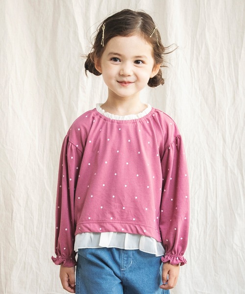 ピンドット×シフォンフリルが可愛い長袖Tシャツ ■point ・衿ぐりがゴム仕様で着脱楽チン! ・キャンディースリーブ袖がさらにガーリーな印象に♪ ----- 透け感:なし 伸縮性:あり