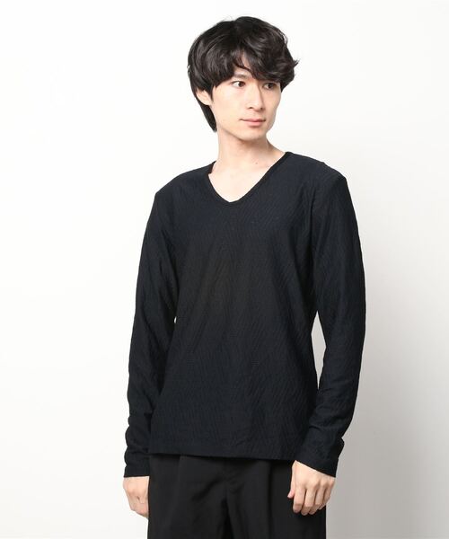■ TORNADO MART ■ <DESIGN> シャープなボディながらも着用感に大変優れた深めのUネックカットソー。 表情のある素材感に、シャープなデザインで様々なシーンに着用しやすい一着にしています。 <TEXTILE> イタリアプラトー地区に位置するSMI社のランダムヘリンボンジャージー素材。 透け感の有るジグザグヘリンボン柄に、立体的なタックプリーツ調のジャカード組織を編み込んでいます。 エレガントな光沢感と、セクシーな柄と奥行きを持った表情が、トルネードマートの定番アイテムとなっています。