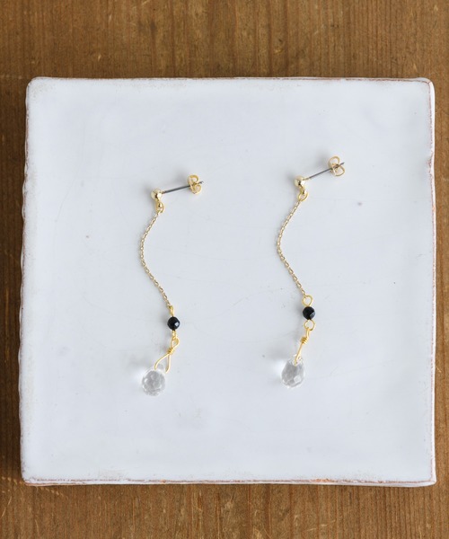 【KATHARINE ROSSセレクト】天然石をシンプルに研磨した上品なピアス。 華奢なチェーンが天然石をより魅力的に引き立ててくれます。 ホワイト:ドロップカット水晶、オニキス パープル:アメジスト 繊細なカラーを楽しめるデザインです。