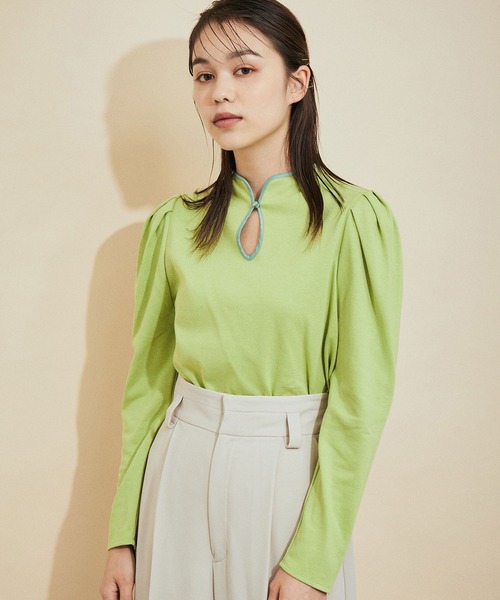 衿元の開きとトリミングがアクセントのデザインカットソー【素材】 一枚着カットソーとして着心地の良いコットンフライス素材を使用 【デザイン・シルエット】 首に沿った衿元のシルエットと、フロントの開き、共布くるみ釦とトリミングがアクセントになっています。 一枚決まるでデザイン性のあるアイテムです。 【カラー】 クロのトリミングが映えるオフホワイト、鮮やかなライトグリーン 【おすすめのスタイリング】 ニットを着始める前の一枚着として着用いただくのがおすすめです。 ブラウスのようにデザイン性のあるカットソーなのでジャケットやブルゾンのインナーにもお勧めです。 ---------------------------------- 裏地:なし 透け感:なし 伸縮性:あり 光沢感:なし 生地感・厚さ:薄手 開き:ボタン ケア方法:手洗い、ウェットクリーニング ---------------------------------- 【モデル着用サイズ】 全色着用モデル身長:167cm 着用サイズ:38 ※店頭・室外で撮影している画像は、光の当たり具合で色味が若干異なって見える場合がございます。 商品の色味は、スタジオ撮影の画像をご参照ください。 ※画像の商品はサンプルです。 実際の商品と仕様、加工、サイズが若干異なる場合がございます。 ※店舗での商品のお取り扱いについて ROPE'の商品は、ROPE'実店舗のみの取り扱いになります。 また、MADEMOISELLE ROPE' の商品は、MADEMOISELLE ROPE' 実店舗のみの取り扱いになります。 ※商品の入荷状況は、店舗までお問い合わせをお願いいたします。 マドモアゼルロペ/マドモアゼル/マドモアゼル ロペ