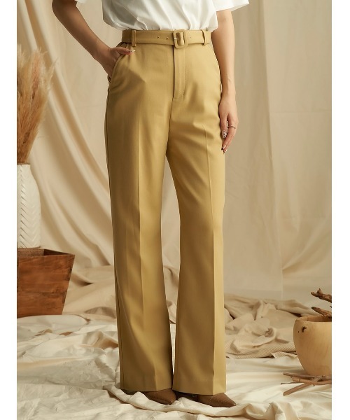 縦ラインを意識したシンプルな美脚見えストレートパンツ!同素材のベルトがセットとなった、合わせに困らないシンプルデザインで着回し力に優れたアイテム♪細身のストレートシルエットなので大人っぽく着こなすことができ、センタープレスが施されているのでよりシルエットが綺麗に見えるのが特徴です。同素材で展開しているビッグシルエットカラージャケットと合わせて大人なスタイリングで着用するのがオススメです♪