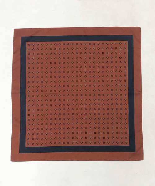 《デザイン》 レンガベースに、縁・ダイヤ柄をネイビーで仕上げたスカーフ。 枠のみで構成されたシンプルなダイヤ柄です。 トラッドな雰囲気と、レンガとネイビーが上品な印象。 コーディネートしやすいカラーリングです。 コンパクトなサイズ感で、 首元に巻いた時にスカーフ角部分が余り過ぎないのもポイントです。 (61㎝×61㎝) 《素材》 なめらかな肌触りの、コットンサテンを使用。 綿素材なので、シーズンレスで使え、取扱いやすい素材です。 ※画像の商品はサンプルとなりますので実際の商品と仕様、加工、サイズが若干異なる場合がございます。 ※こちらの商品はFIVE FOXes独自の採寸方法となっています。 本サイトのサイズガイドと採寸方法が異なる場合がありますのでご了承ください。