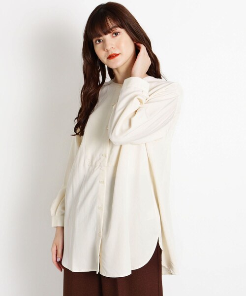 【デザイン】フロントのビブヨークを切り替えたチュニック。シャープなバンドカラーを合わせてマニッシュに仕上げました。トレンドの長めなチュニック丈です。【生地感】滑らかな風合いと着心地の良いレーヨン混の素材を使っています。※01・05サイズは、WEB限定となります。モデル情報:身長168cm B75 W58 H85 着用サイズ:02(M)店舗へのお問い合わせ商品番号:768-83022●製品寸法:01(S):着丈70cm B109cm 袖丈51cm 肩幅48cm02(M):着丈73cm B112cm 袖丈52cm 肩幅51cm03(L):着丈75cm B115cm 袖丈52cm 肩幅51cm04(LL):着丈78cm B118cm 袖丈53cm 肩幅53cm05(3L):着丈79cm B122cm 袖丈53cm 肩幅54cm備考: