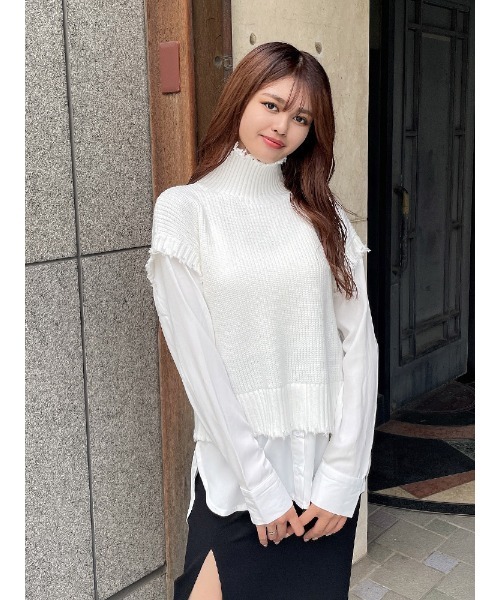 ハイネックのニットベストと1枚でコーディネートが完成する万能アイテムです。