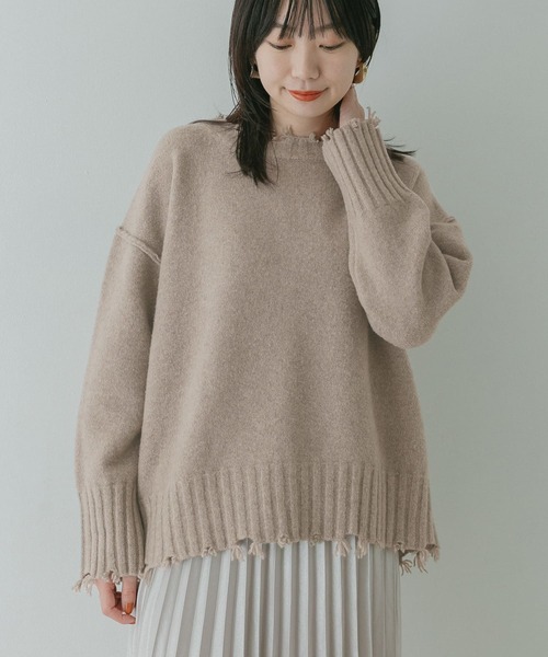 【今年らしさ&存在感を高めるダメージ加工に注目】首元と裾、そして袖口にダメージ加工を施した今年らしい表情のニット。アームホールと背中のアウトリンキングもポイント。一見カジュアルな印象ですが、ウォーム感のある上質な素材で仕上げているので大人の女性も取り入れやすい1着になっています。POINT・今年らしいダメージデザイン・もちもちとした肌触り抜群の素材・合わせやすいカラーバリエーションCOORDINATEオーバーサイズながらもアウターは羽織れるのでロングスパンでの着回しが可能。リラックス感のあるパンツを合わせてルーズに着こなすと大人っぽさが一層引き立って◎-----------------------------透け感 : なし伸縮性 : あり裏地 : なし光沢 : なしポケット : なし-----------------------------※この商品は、部分的にダメージ加工を施してありますので、糸切れ・生地切れが発生している部分があります。ダメージ加工の風合いが一点一点異なる場合がございますので予めご了承ください。※摩擦や汗、雨などの使用条件等により、色落ちや他の物への色移りの可能性がございますのでご注意ください。※その他お取り扱いに関しましては、商品に付属のアテンションタグをご覧ください。※商品画像は、光の当たり具合やパソコンなどの閲覧環境により、実際の色味と異なって見える場合がございます。予めご了承ください。 ※商品の色味の目安は、商品単体の画像をご参照ください。モデル身長:165cm, 167cm着用サイズ:one洗濯表記:手洗い , ドライクリーニング※詳しい洗濯方法については、商品の品質表示タグをご覧ください