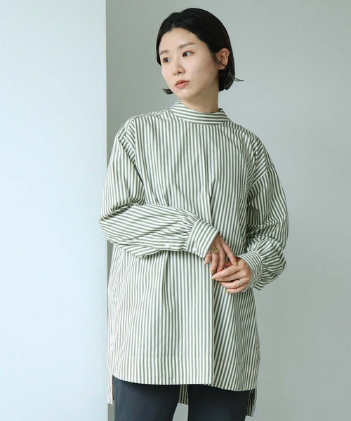 ■80/2ストライプシャツ繊細な先染ストライプの生地。キナリ×グリーン/ネイビーのコンビになっており、優しいカラーリングが取り入れやすい一枚に。透け感はないですが、薄手なブロードなので、パンツにインしたり重ね着にもおすすめです。肌触りも滑らか。ストライプのハイネックブラウスは、甘くならないように、すっきりしたギャザー感で縦長のラインに。すっきりしたボトムで着るのも素敵ですが、足元にボリュームのあるパンツを持ってきてゆるさを出すのものもおすすめです。洗濯:手洗い可※ネイビーの画像はサンプルです。カーキは製品です。実際の商品と仕様・加工・サイズ等が若干異なる場合がございます。※撮影画像は光の当たり具合やモニターの環境により色味が違って見える場合がございます。※取り扱いの注意については取り扱い表示をよくご確認の上、着用をお願い致します。※この製品は独特の風合いを 出す為に製品洗いをしてい ます。一枚一枚の色味、風 合い、サイズ等も微妙に違 いますが、他の製品では味 わえない雰囲気をお楽しみ 下さい。 ※この製品を洗濯する際には多少縮む 場合がありますので、形を整えてか ら日陰で干して下さい。