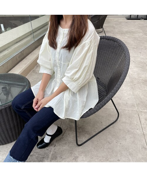 細かいシワ加工を施し、ナチュラルな風合いが魅力のデザインシャツ。 すっきりとしたバンドカラーにボリューム感のあるスリーブデザインで、カジュアルながらに女性らしさも引き立てる1枚。 切り替えラインとギャザーデザインでゆったりしており、軽く涼やかな素材のためシーズンレスに活躍するアイテムです♪ ※モデル身長:161㎝ ◾️クリックポストにて代引きをお選び頂いた方は、400円プラスさせていただき、宅配便代引きにて発送させていただきますのでご了承下さい。 ◾️カラー アイボリー・ベージュ・ブラック ◾️サイズ 着丈68cm 身幅51cm ※多少の誤差は予めご了承ください。 ◾️素材 綿95% ポリエステル5% ※こちらの商品は海外縫製の為、多少歪み・縫製の甘さ(糸の出)などがある場合がございます。予めご了承下さい。 ※こちらの商品は、素材特有のニオイがします。ニオイは洗濯や時間が経つにつれて減少致します。 匂いの感じ方には個人差がございますが、気になる方はしばらくの間天日干しすることをお勧めします。不良品ではございませんので、予めご了承の上ご注文をお願い致します。