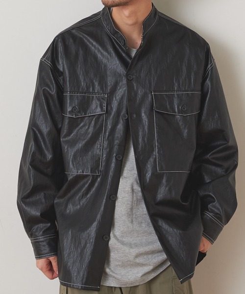 ■デザイントレンドのフェイクレザー素材を使用したシャツジャケットです。CPOシャツ型の大きめな胸ポケットがアクセント。バンドカラーなので、程よい抜け感を演出してくれます。ゆったりとしたサイズ感なので、シャツとしてはもちろん、ライトアウターとして羽織るだけでも様になります。ホワイトステッチがレザーに映える、細かいところまでこだわりの詰まったアイテムです。■素材まるで本革のような質感のフェイクレザー素材です。合成皮革を使用しているので、本革よりも手入れがしやすくデイリーにお使い頂けます。本革と比べ柔らかい素材なので、ボリュームが出すぎない綺麗なシルエットで楽しんで頂けます。■スタイリング手持ちのTシャツの上に羽織るだけでモードな雰囲気を演出してくれます。バンドカラーなので、パーカーやタートルネックなど首元にボリュームがあるアイテムとも相性抜群です。モードからカジュアルまで幅広いテイストでお使い頂けるオススメのシャツジャケットです。気になった商品はお気に入り登録がオススメです! 入荷情報や、クーポン情報が通知されるようになります。※画像の商品はサンプルです。 実際の商品と仕様、加工、サイズ、素材が若干異なる場合がございます。