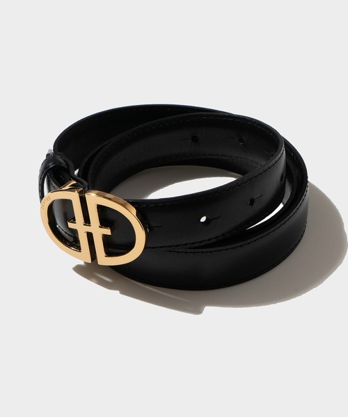 オリジナルバックルの付いたレザーベルト。ブランドネームの頭文字をデザインしたバックル左下にブランドネームをレーザーでエングレービング。2色展開。