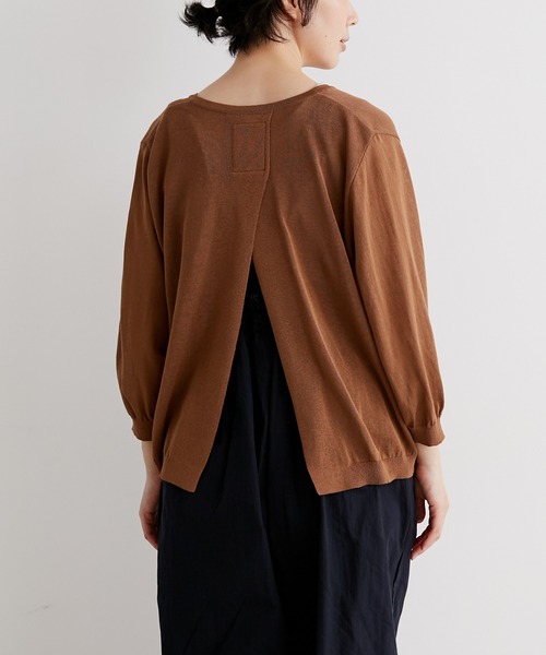 ポルテデブトン【Porter des boutons】「つぼみをつける」シンプルなデザインの中に遊び心が見え隠れする 何よりも心地良く、長く大切にしたくなる服。-------------------------------------------------------------------細い糸で密に編まれた、薄手のサマーニットのカーディガン。スカートでもパンツスタイルでも、上品にまとまって、冷房対策にもなる頼もしい1枚です。身体のラインが出ない、程よくゆったりした身頃と袖。前開き部分のスナップボタンは身頃中央に1箇所、裾に2箇所胸下から自然に重ねていただくとやさしい丸みのあるシルエットになります。パーツによって編地の厚さを変えており、袖部分は身頃より薄地に仕上げられています。風通しが良く見た目も涼やかです。ざっくり開いたバックスタイルが一番のデザインポイント。後ろ身頃は背中から自然に広がります。可愛らしさの中にピリッと大人のエッセンスが効いたデザインです。すっきりとしたクルーネックは衿のあるインナーとも相性が良いので、ブラウスとのコーディネートも楽しめますね。-------------------------------------------------------------------【AMB100貨】ひと・もの・ことがぐるりと巡りさまざまな場所で出会った「良いもの」をお届けするオンラインの百貨店です。Clean/unique/cheerfulをテーマに私たちが選んだ様々なジャンルのものを、そのまわりにあるストーリーと共にご紹介しています。-------------------------------------------------------------------※撮影画像は、光の当たり具合やモニターの環境により色味が違って見える場合があります。あらかじめご了承ください。※取り扱いの注意については取り扱い表示をよくご確認の上、着用をお願いいたします。