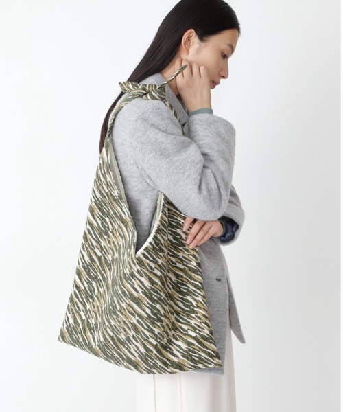 大人気のバグマティの季節感のあるジャガード生地を使用したトートバッグです。 華やかなゴブラン織りと三角形のようなシルエットの大きめのサイズ感、持ち手部分はご自身でお好みの長さに調節して結べる仕様になっています。 パンツスタイルからワンピースまでシンプルなコーディネートのアクセントに、持っているだけでトレンド感あるスタイリングが完成します。