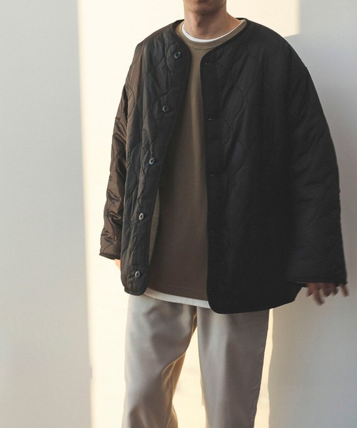 コーディネートを楽しむリバーシブル仕様 モッズコートのインナーキルトをモチーフに、表地はキルト、裏はボア、リバーシブル仕様で仕上げたビッグシルエットジャケット。 落ち着いたカラーリングでミリタリー調の表側とオフホワイトのボア素材で柔らかな和みの雰囲気が漂う裏側。表情の違いで多様なコーディネートを楽しむことが出来るのが魅力的。 休日スタイルにバリエーションをもたらす活躍必至の1枚です。