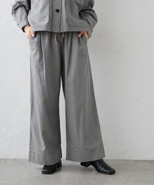 ピュアルセシン 2021 autumn&winter collection【sophisticated retro】洗練されたレトロな雰囲気を新しく取り込みながら、幸福感ある生き方を求め安らぎや優しさをテーマに装い心地よいリラックスしたスタイリング。引き続き環境に優しいサステナブルでありながら、丸みを帯びたフォルムやフラッフィーな素材感で体を包み込んだ柔らかなスタイルの提案。◇大人カジュアルなヒッコリーワイドパンツ◇●デザインウエストのロープ紐がコーディネートのアクセントになるワイドパンツ。ゆったりとしたシルエットでリラクシーな穿き心地です。深めの股上でスタイルアップ効果も高いのが嬉しいポイント。●カラー展開オフホワイト、ベージュ、チャコールの3色展開。●素材コットンとヘンプ(麻)の混合素材なので柔らかく、軽やかな穿き心地です。●スタイリングカジュアルなカレッジスウェットやブラウスなどアイテムを選ばず幅広いアイテムと着回せる1枚です。===============================透け感:なし裏地:なし伸縮性:なし光沢感:なし生地の厚さ:普通【スタッフコメント】年齢:20代前半/身長:152cm/普段着用サイズ:Mサイズサイズ感:スニーカーを合わせても引きずることなく穿けました。素材感:綿麻の素材なのでロングシーズン活躍しそうです。===============================※撮影場所やお使いのモニター環境により若干お色味が異なる場合がございます。特にロケの撮影では明るく見える傾向にございます。※予約商品はサンプルで撮影をしております。若干の仕様が変更になる場合がございますので予めご了承の上ご注文くださいますようお願いいたします 。