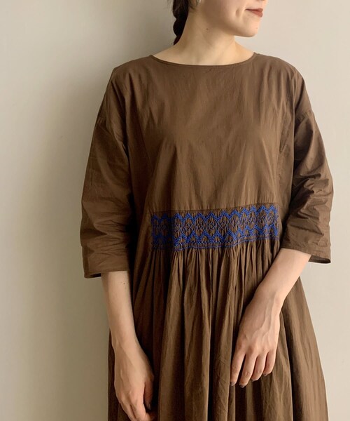 ウエストにギャザーと刺繍が入ったワンピース。とても柔らかい綿素材で、さらっとした軽い着心地です。ギャザーが入ることで落ち感があり、広がらずスッキリと見えます。ウエストのさりげない刺繍がポイントです。