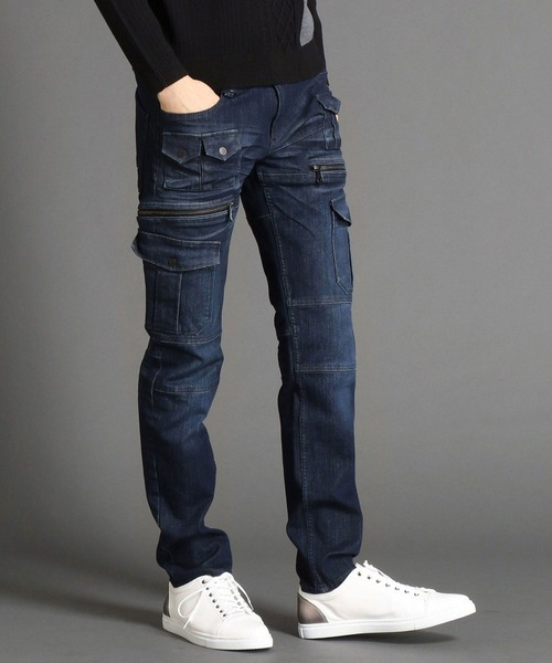 #ブラック/ネイビー:合計11ヶのポケットが付いたカーゴパンツ。重く野暮ったくなりがちなカーゴパンツですが、ポケットの位置とサイズを調整する事でシャープな印象に仕上げています。#ブラック系1/ネイビー系1:各切り替えに大小さまざまな6個のファスナーを配したライダースデザイン。ファスナーを部分的に開けて着用したりとご自身で様々なアレンジを楽しんで頂けます。生地には11ozの2wayストレッチデニムとブラックデニム素材を使用。柔らかなタッチとタテヨコ共に非常に良く伸びるストレスを感じさせないストレッチ性が特長です。※インディゴ染め素材なので色落ちし、褪せてきます。素材の特性としてオススメの際は注意して下さい。それと変色しやすいので、強い光には当てない、当たらない様に取り扱いも注意して下さい。
