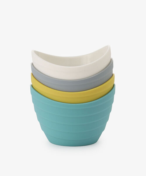 ボウルの代わりに使えるシリコンカップ4個セットです。調味料をかき混ぜたり、刻んだ薬味を一時的に入れておいたり、お料理シーンでマルチな活躍が期待できる1品。4個セットでのお届けなので使うたびに洗わずに済むのが魅力です。ユニークなフォルムの間口は、混ぜているときにサイドをつかみやすく、汁物が注ぎやすいのも特長。電子レンジにもしっかりと対応するので加熱調理もお手の物。食器洗浄機にもかけられる取り扱いのイージーさも、デイリーユースを後押しします。やわらかなシリコンはスタッキング時にもかさばりにくく便利。 *ディッシュウォッシャー〇、電子レンジ〇 *耐熱温度/220℃