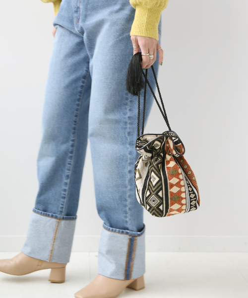 【2021AW】 B.C STOCK 存在感抜群、コーディネートの主役級バッグ! 高級感のあるジャガード織の生地を使用し、持ち手にはフリンジを施しました。 ブラウンとブラックを基調とした落ち着いた色合いなので、柄ものであっても派手すぎない印象です◎ 遊び心溢れる巾着バッグで、コーディネートの幅がぐっと広がります。 ※取り扱いについては、商品についている品質表示でご確認ください。 ※店頭・屋外での撮影画像は、光の当たり具合で色味が違って見える場合があります。商品の色味は、スタジオ撮影の画像をご参照ください。