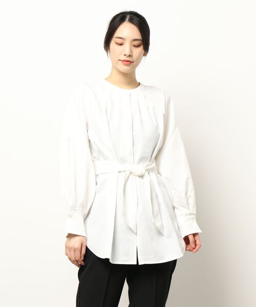 1枚で4通りの着こなしができるブラウス♪ ①ボタンをしめてフロントボタンスタイル ②ボタンを後ろにしてもOK! ③ボタンを開けて羽織りとしても◎ ④共生地ベルトをウエストで結んでウエストマーク 大人可愛い魅力あふれるボリュームスリーブブラウス。前後着用可能+共生地ベルト付きで、ボタンを開けて羽織りとしても着られるマルチウェイ。 袖口がきゅっとなったデザインなので、袖をたくしあげる着こなしもおすすめ。 【素材・サイズ感】 少し厚みのあるツイルブラウス地。 適度なハリと少しマットな質感が、カジュアルにもキレイめにもマッチする素材です◎ ゆとりのあるシルエット+ヒップがしっかり隠れる丈なので、体型カバーも叶う1着。