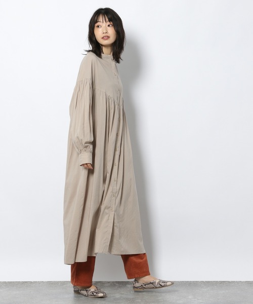 ふわっと軽い着心地のシャツワンピース。 フロントにほどこされたVラインの切替と、ギャザーがデザインポイント。 たっぷりのギャザーで、動きのあるアイテムに仕上げています。 【素材】 コットン×レーヨンのなめらかで軽さのある素材を使用。 【スタイリング】 1枚ではもちろん、ベストとのレイヤードでより今年らしいスタイリングに。 スウェットやニットとのレイヤードもオススメです。