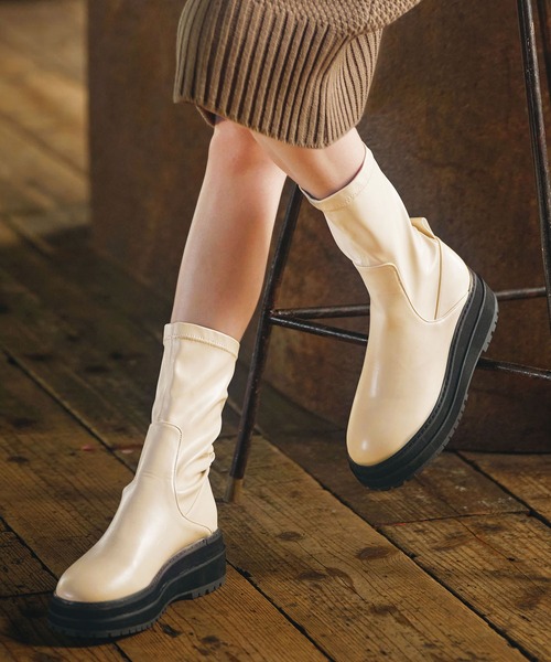 ソックスライクな履きやすさと足の華奢見えに効くストレッチブーツ ボトムに合わせやすいミディ丈のブーツは、ボリュームソールがスタイリングのアクセントに。 足にしっかりフィットするストレッチ素材で履き心地良く、脚を華奢に見せてくれる効果も。 ■対応サイズ/ S(22.5cm) M(23.0~23.5cm) L(24.0cm) LL(24.5cm) ■ ソール高さ:約6.3cm ■ 履き口/S:28.9cm、M:29.6cm、L:30.3cm、LL:31.0cm ■ 履き口からかかとまで約23cm(Mの場合) ■ ワイズ2E程度 ※ 商品の特性上、色の出方が多少異なる場合があります。 --------------------------------------------------------------------- ※サイズ寸法は実際の寸法と多少の誤差がある場合が ございます。 ※ご覧いただいているPC/WEB環境や撮影環境により、 多少色味が異なって見える場合がございます。 【お買い物をよりお楽しみいただく為に】 ▼商品のお気に入り登録をおすすめします♪ 『♡をクリック!』 完売カラーの再入荷やラスト1点の追加、 セールの際の通知を受ける事ができます。 ブランドのお気に入り登録もご一緒にお願い致します。 ---------------------------------------------------------------------