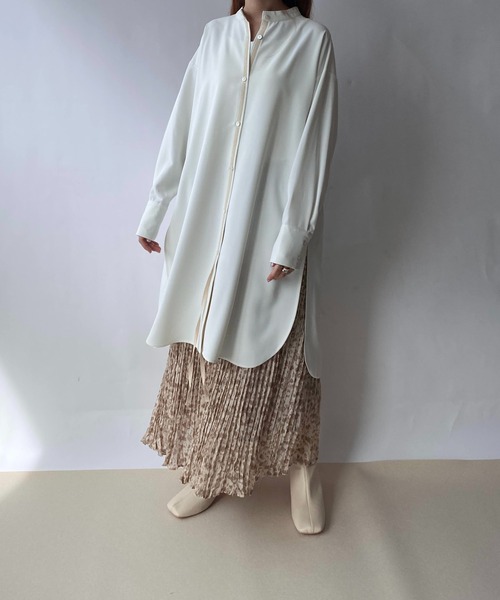 女性らしく着こなせるふんわり裾広がりのAラインシルエット 前立てから続くテープがエレガンスなロング丈シャツです。両側の裾に深めのスリットをあしらい抜け感をプラス、どの方向から見てもきれいなシルエットにこだわりました。あわせるボトムを選ばない万能アイテムです。 無地のシンプルな素材に膝くらいの丈の長さなので着回し力抜群! 春夏にはTシャツやキャミソールなどのカットソーを合わせ、 羽織りとしてさらっと羽織るのがおすすめです。 秋冬にはボタンをしめてベストやカーディガンをさらっと重ね着することもできます。 スタンドカラーで首元がすっきりして見えるので、 アクセサリーで女性らしさをプラスするとこなれ感が出ます。 コーデのポイントはシャツならではのストンとしたシルエットを生かすこと。 すっきりとした印象のロング丈スカートやタイトめの細めパンツと好相性です。 ちょっとしたランチやお出かけに大活躍すること間違いなしです。 洗濯:洗濯機使用可 【色展開】 ・オフホワイト(白 白色) ・ブラック(黒 黒色) 【サイズ展開】 ・フリーサイズ 「A.T」 動きやすくて、リラックスできる着心地。 長く着られるシンプルさ。 かつ個性的に見えるシルエットの妙。 どんなシーンにも不思議となじむ雰囲気。 . 普遍的な好きなものに【今】をプラスした毎日を楽しくする服。