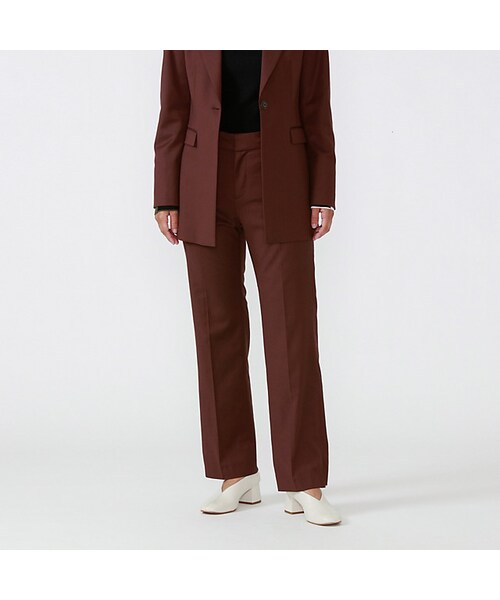 2WAYディテールが魅力のサイドジップストレートパンツ。【素材】パンツなどに使い勝手の良いポリエステル×レーヨンに、梳毛の素材をブレンドすることで飾らない上質感が感じられるハイエンドな生地を使用。シャープな表情に軽さと柔らかさを兼ね備えた素材です。【シルエット/デザイン】適度なフィット感とセンタープレスをあしらった端正なシルエットが知的で上品な大人の佇まいを演出。サイドジップは長めのものを使用していますので、スリットの開き加減はお好みで調整いただけます。【スタイリング/その他】同素材でジャケット(商品番号:62D61632)のご用意もあるので、セットアップでの着用もお楽しみ頂けます。上質な素材感と深みのあるカラーはオフィスからデイリーまで幅広くスタイリングしやすく、さらに2WAYディテールが汎用性を高めてくれる一着になっております。
