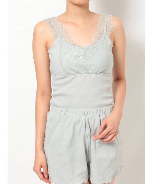 MERCURYDUOの提案するルームウェアシリーズ【GENTLE】 テレコに繊細なレースを上に重ねたカップ付きのレースキャミです。 太めのレースストラップは、同シリーズで展開しているトップスやワンピースと合わせた時に 襟ぐりからちらっと見えるような設計で作っているので、 合わせて着こなすとより可愛さが増します。 フロントの胸下にはゴムが入っているので、 アンダー部分が浮きづらくホールド感が出るように仕立てているのもさりげないポイントです。 ▼スタイリング 同素材で作っているテレコのショートパンツとセットアップで着たり、 その上にカットソーやワンピースと合わせるのがお勧めです。 ※胸下のギャザー分量は少し減り、その代わりゴムの範囲が広くなります。