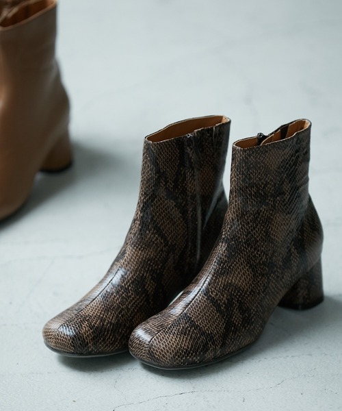 つま先ゆったりで快適な履き心地。感度の高い足元へ仕上げる一足。【デザイン・シルエット】 ・丸みのある美しいカーブを描くオブリークトゥ。 ・足首に自然と馴染むすっきりとした筒幅。 ・安定感のあるブロックヒール。 ・オンラインストア限定商品。 【カラー】 ・カラーによって柄が異なります。 ブラック(01)キャメル系(26):無地 ブラウン系(22):パイソン 【スタイリングポイント】 ・ミモレ丈のスカートに合わせたバランスが一押し。 ・スウェットパンツなどのリラックスパンツをインしてもOK。 ※撮影時の光、お使いのモニター環境によって色の見え方が違う場合がございます。 ※幅:親指の付け根~小指の付け根の寸法になります。 ワイズ(足囲):親指の付け根~小指の付け根を通りぐるりと一周させた寸法になります。 サイズ詳細をご確認ください。 ※重量:両足595g 重量は、サンプル24.5cmでの計測になります。 実際の商品と多少異なる場合がございます。 : 《スタッフA》 身長:158cm 普段の着用サイズ:24cm 足幅:10.5cm 足囲(ワイズ):22.7cm ぴったりのサイズ:24.0cm 履き心地,サイズ感:23.5cmと24.0cmを履き比べました。 履く時に足首が少し細めに感じましたが、履くと爪先にもゆとりがあって楽です。太ヒールなので安定感もあり履きやすいです。 素材感:硬すぎないしっかりとした素材です。少しふわふわした裏地で足あたりも良いです。 : 《スタッフB》 身長:157cm 普段の着用サイズ:23or23,5cm 足幅:9.5cm 足囲(ワイズ):22cm ぴったりのサイズ:23.5cm 履き心地,サイズ感:ぴったりのサイズ:23.0cmと23.5cmを履き比べました。 23.0cmだとぴったりで足首周りが少し窮屈に感じました。 サイズで悩まれるのであれば、普段のサイズより1つ上をお選びすることをお勧めします。 素材感:ソフトな素材ではないので、履いた時に少しシワはよります。 : 《スタッフC》 身長:151cm 普段の着用サイズ:22.5or23.0cm 足幅:8.5cm 足囲(ワイズ):20cm ぴったりのサイズ:23.0cm 履き心地,サイズ感:23.0cmと23.5cmを履きました。足首がフィットし、履き口も程よくゆとりがあり厚手の靴下も履けそうです。 23.5cmも履いてみたのですが、脱げることはないですがかかとが少し緩めです。 素材感:合皮で足首も動かしやすい素材感です。履き口にゴムが入っていて、歩いた時に伸びるので痛くならないです(個人差はございます)。