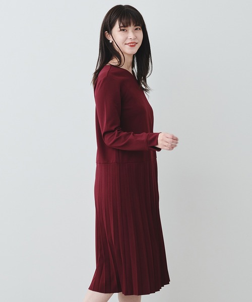どんな時も頼りになるシンプルな上品ワンピース 伸びやかでほどよい厚みのカットソージョーゼットで、しわが気になりにくく、一枚でスマートに着映えるミモレ丈の快適ワンピ。 顔まわりをすっきり見せる浅めのVネックに、生地の落ち感が作る縦シルエットが、体形をきれいにカバーしてくれます。 ローウエストのプリーツスカートの切り替えが、クラシカルで落ち着いた雰囲気を演出。 合わせる小物でカジュアルにもフォーマルにも着られるから、大人のワードローブに備えておきたい一着です。