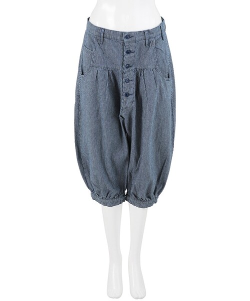 ヒッコリーデニム素材を使用したクロップド丈パンツ。後ろポケット部分にあしらわれたハンカチーフがポイント。この製品は独特な風合いを出すため、製品加工を行っております。1点ごとにサイズや風合い等、特徴が異なりますのでご了承ください。Torso:H163.5 B80 W58.5 H86 着用サイズ:02サイズ