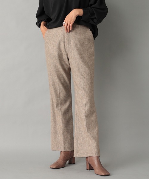 ツイード素材見えで一気に秋冬らしいコーディネートに ●デザイン すっきりとしたフレアーシルエットのウールパンツ。 センタープレス入りで美脚効果も抜群で、きれいめな見え感の一枚。 今季注目のツイード見えの生地で、国内の工場で丁寧に仕分けされたリサイクル糸を使用した、サスティナブルなリサイクルウールを使用しています。 後ろベルトゴム入りでリラックスした履き心地も魅力。 ●おすすめコーディネート きれいめスタイルからカジュアルまでオンオフ両用しやすい便利なアイテムです。 シンプルなニットやカットソーなどと合わせるだけで決まります。 ●素材 表地:毛54% ポリエステル41% ナイロン3% レーヨン1% ポリウレタン1% 裏地:ポリエステル100% 洗濯方法:ドライクリーニング 透け感:なし 裏地:あり 伸縮性:なし 生地の厚さ:普通 光沢:なし ポケット:あり ファスナー:あり ウエストゴム:あり スタッフ着用コメント 160cm 38サイズ 骨格:ウェーブ センタープレスデザインとフレアシルエットでコーディネートがキレイめに仕上がるパンツ。 股上が深いため履き心地抜群! 裏地も付いているので暖かいです! オンオフ兼用で使えるので1枚持っておくと着回しが効くアイテムです♪ 160cm 38サイズ 骨格:ウェーブ すっきり見えが叶うパンツですが、後ろがゴム仕様になっているので楽な着心地です。 フレアのシルエットとセンタープレスで、脚を長く見せてくれます! 裏地もあるので、安心感があります。丈は身長160cmで足首にかかる程度でした。 キレイめにもカジュアルにも使えるので、着回しが楽しめそうです! 158cm 38サイズ フラットシューズでも足が長く見える美脚ボトムです。 ウエストは後ろ部分だけゴム仕様なので、インをしてもお腹まわりがスッキリ見えるデザインです。 裏地もあるので、ウールのチクチク感も気になりません。 着丈は38サイズだと2~3cmのヒールでちょうど良かったです。 骨格タイプ ・ストレートタイプ 全体的に筋肉質で体にメリハリがあるタイプ。 腰とバスト位置も高く厚みがあり、ひざ下は細目。 ・ウェーブタイプ 全体的に柔らかな曲線の体のライン。 バランスの重心が下半身にあり、上半身は華奢で薄い印象。 ・ナチュラルタイプ 筋肉や脂肪があまり感じられなく、全体的に重心の偏りがないタイプ。 骨組みはしっかりしており、肩や手首、関節が目立つ特徴がある。 ============================== 【注意点】 ※画像の商品は光の照射や角度、お使いのモニター環境により、 実物と色味が異なる場合がございます。 あらかじめご了承下さいませ。 ============================== 【お買い物をもっと便利に楽しく♪】 『♡』をクリックでお気に入り登録 ・「商品のお気に入り登録」で・・・ ラスト1点や再入荷の通知が届きます。 登録して頂いた商品だけが対象となる、あなただけのタイムセールが開催されることも! ・「ブランドのお気に入り登録」で・・・ 新商品や再入荷など、いち早くブランドのお得な情報を受け取ることができますので、ご登録をおすすめします! ==============================