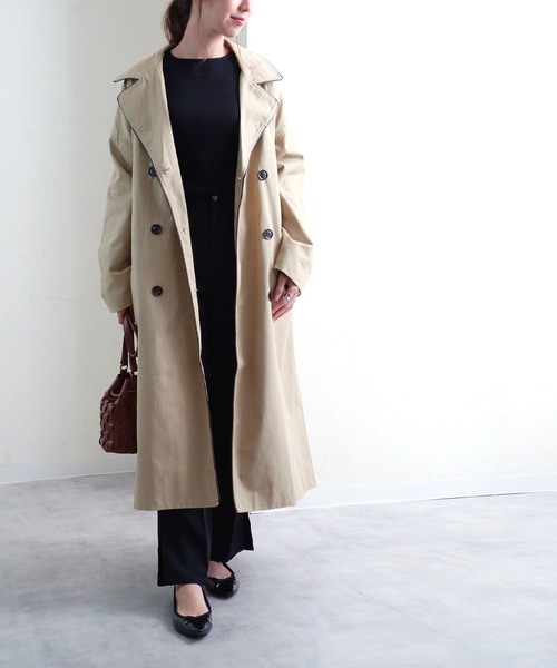 ◆羽織るだけでコーデの主役に。デザイントレンチコート◆ ゆるっと肩を落としたオーバーサイズのロングトレンチは1枚でスタイリッシュな着こなしに。 スタイルアップして見える綺麗なシルエットに仕上げました。 袖口のベルトは絞りが調節可能で、キャンディスリーブ風にアレンジできるのも嬉しい。 バイカラーのレザー調パイピングがコーデのアクセントに。 程よい柔らかさのコットンツイルで扱いやすく、ロングシーズン着用可能です。