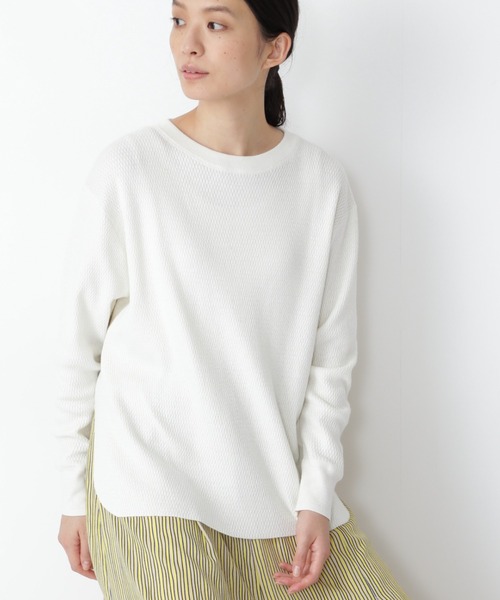 とても目つらが綺麗で表面が滑らかなタッチなので肌触りが良いサーマルニットです。リサイクル30%混の環境に配慮した素材を使用しています。<br>1枚着として着ていただけます。前後逆に着ていただけますのでタンクトップと合わせて襟元のレイヤードを楽しめます。 ----------------------------------------------------------------------------------- 【HUMAN WOMAN】 1998年よりスタートした”フレンチトラッド”をベースにした大人な女性のためのカジュアルブランド。 素材や縫製にもこだわってつくられた上質な日常着は、長い時間大切にお使いいただけるようにお作りしています。 約20年の歴史の中で、「数年着続けても安心感があるお洋服」と多くの方に高いクオリティを認められてきました。 ベーシックなアイテムにさりげなく加えたトレンド感で、「私らしいカジュアルスタイル」を見つけてみませんか。 「カジュアルが好き」「少しだけトレンドも取り入れたい」 「大切に着たい」「私らしくいたい」そんな思いをかなえるお洋服をHUMAN WOMANでは提案しています。 -----------------------------------------------------------------------------------