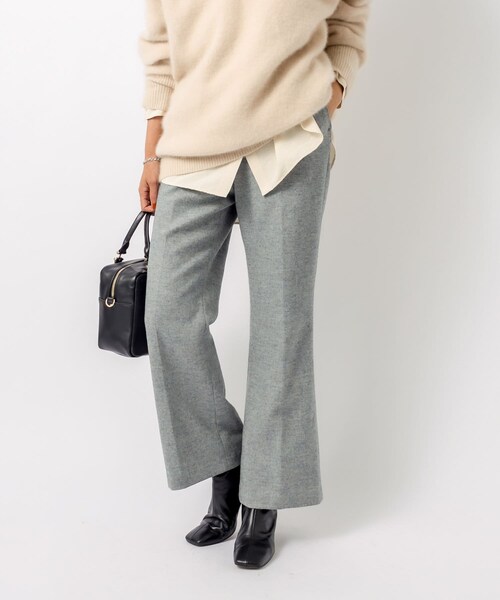ツイード素材見えで一気に秋冬らしいコーディネートに●デザインすっきりとしたフレアーシルエットのウールパンツ。センタープレス入りで美脚効果も抜群で、きれいめな見え感の一枚。今季注目のツイード見えの生地で、国内の工場で丁寧に仕分けされたリサイクル糸を使用した、サスティナブルなリサイクルウールを使用しています。後ろベルトゴム入りでリラックスした履き心地も魅力。●おすすめコーディネートきれいめスタイルからカジュアルまでオンオフ両用しやすい便利なアイテムです。シンプルなニットやカットソーなどと合わせるだけで決まります。●素材表地:毛54% ポリエステル41% ナイロン3% レーヨン1% ポリウレタン1%裏地:ポリエステル100%洗濯方法:ドライクリーニング透け感:なし裏地:あり伸縮性:なし生地の厚さ:普通光沢:なしポケット:ありファスナー:ありウエストゴム:ありモデル情報:H165 B83 W60 H84 着用サイズ:36--------------------------------------------------------------------------------【注意点】※画像の商品は光の照射や角度、お使いのモニター環境により、 実物と色味が異なる場合がございます。あらかじめご了承下さいませ。--------------------------------------------------------------------------------【『ハート』をクリックでお気に入り登録】・ラスト1点や再入荷の通知が届きます。 -------------------------------------------------------------------------------- #ベーシック#カジュアル#スタイルアップ#センタープレス#美脚#パンツコーデ#今買いアイテム#無地#スタンダード#フレアパンツ#レギュラー#ウエストゴム#フルレングス#ストレスフリー#美脚#おでかけ#お仕事コーデ#美脚パンツ